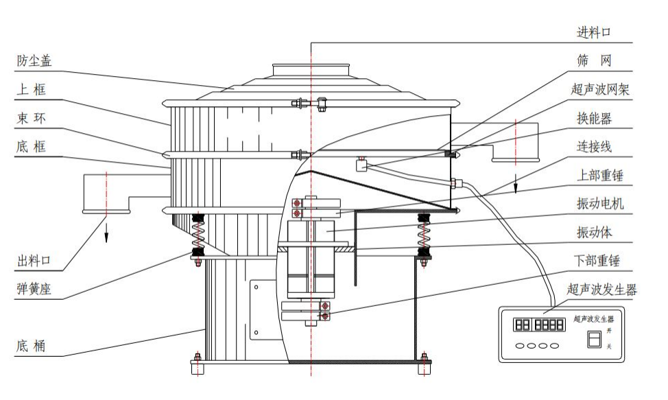 增加一套超聲波系統使其在篩網面上疊加一個高頻率低振幅的超聲振動波,促使超、微細粉體接受巨大的超聲加速度從而使篩面上的物料始終保持一種松散的狀態。