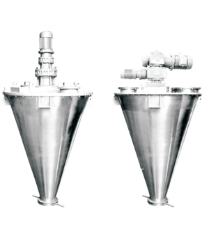 雙螺旋錐形混合機筒內兩只非對稱螺旋自轉將物料向上提升,轉臂慢速公轉運動:使螺旋外的物料,不同程度進入螺柱,從而達到全圓周方位物料的不斷更新擴散,被提到上部的兩股物料再向中心凹穴匯合,形成一股向下的物料流,補充了底部的空缺,從而形成對流循環的三重混合效果。物料在較短時間內獲得了均勻混合,混合程度較高。雙螺旋錐形混合機是一種新型、高效、高精度的混合設備,廣泛適用于制藥、化工、飼料等行業的各種粉粒體物料的混合。