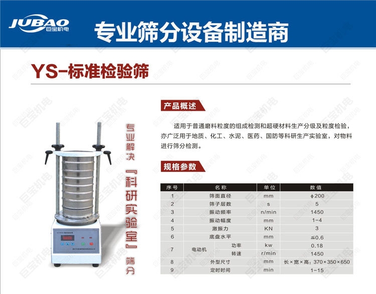 試驗篩型號根據(jù)篩網(wǎng)直徑分為YS200型和YS300型,設計有面板控制啟動開關、定時器,操作簡單,使用方便。標準的200mm貨300mm檢驗篩有對應的夾具,可選擇加裝1層到8層篩體,對所檢驗的物料可以分解出多組樣品。采用集成電路控制,振幅、頻率、振動方式都可以調(diào)整;噪音低、重量輕、精度高;適合實驗室、檢驗室對顆粒、粉末、漿液的粒度檢驗、分析,以及生產(chǎn)在線的質(zhì)量檢驗,性能卓著。