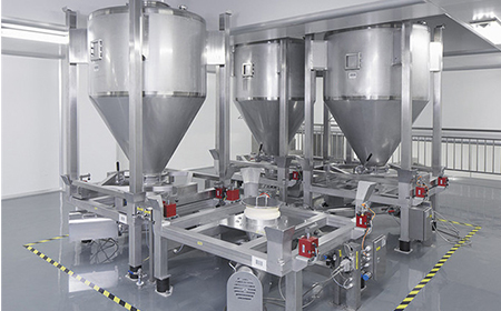 在投料環節,物料使用無塵投料站或噸袋拆包機等投料設備投料,物料密閉下料至料倉,過程中采用單機除塵或集中除塵,防止物料飛揚。系統根據控制指令要求,按照工藝配方參數自動完成主輔料的稱重配料,當數值達到預設目標值時,則關閉加料閥門并輸送至給料機中。物料在輸送過程中,對于流動性不好的物料,可增設振動給料機或活化助流裝置等,提升物料輸送效率。