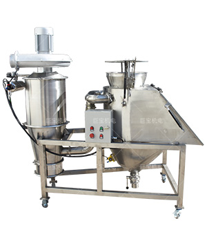 本系統由電動葫蘆起吊裝置、設備支架、氣動夾帶裝置、氣動拍打裝置、緩存料倉,純氣動控制器及輔助連接部分的設備元件共同組成。與物料接觸部分可采用316L不銹鋼、304不銹鋼,支架采用304不銹鋼/Q235碳鋼,表面亞光,保護完好,設備底腳(四只)采用不銹鋼板打孔,用膨脹螺栓固定于地面。