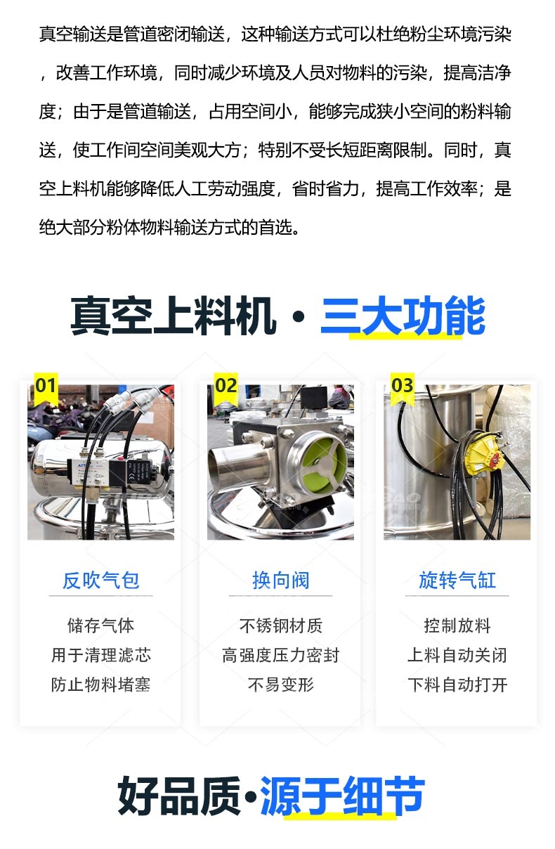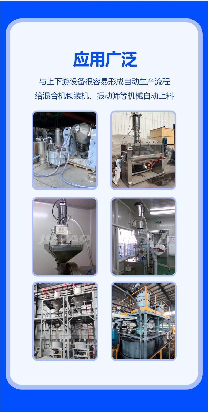 由于真空上料機是采用負壓管道密閉輸送,這種輸送方式可以杜絕粉塵環境污染,改善工作環境,同時減少環境及人員對物料的污染,提高潔凈度;由于是管道輸送,占用空間小,能夠完成狹小空間的粉料輸送,使工作間空間美觀大方;特別不受長短距離限制。同時,真空上料機能夠降低人工勞動強度,提高工作效率,是絕大部分粉體物料輸送方式的首選。